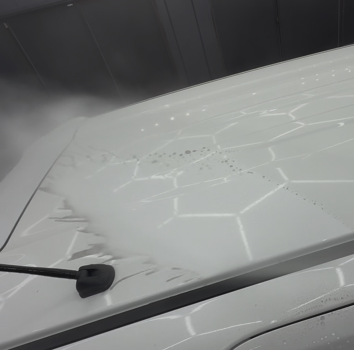 温水洗浄には大きなメリットがあります。油分や頑固な汚れは温度が高いほど落ちやすくなり、ボディに固着したスケールも効果的に浮き上がらせることができます。専用のカーシャンプーと40度のお湯で、ボディ全体を丁寧にプレウォッシュしていきます。