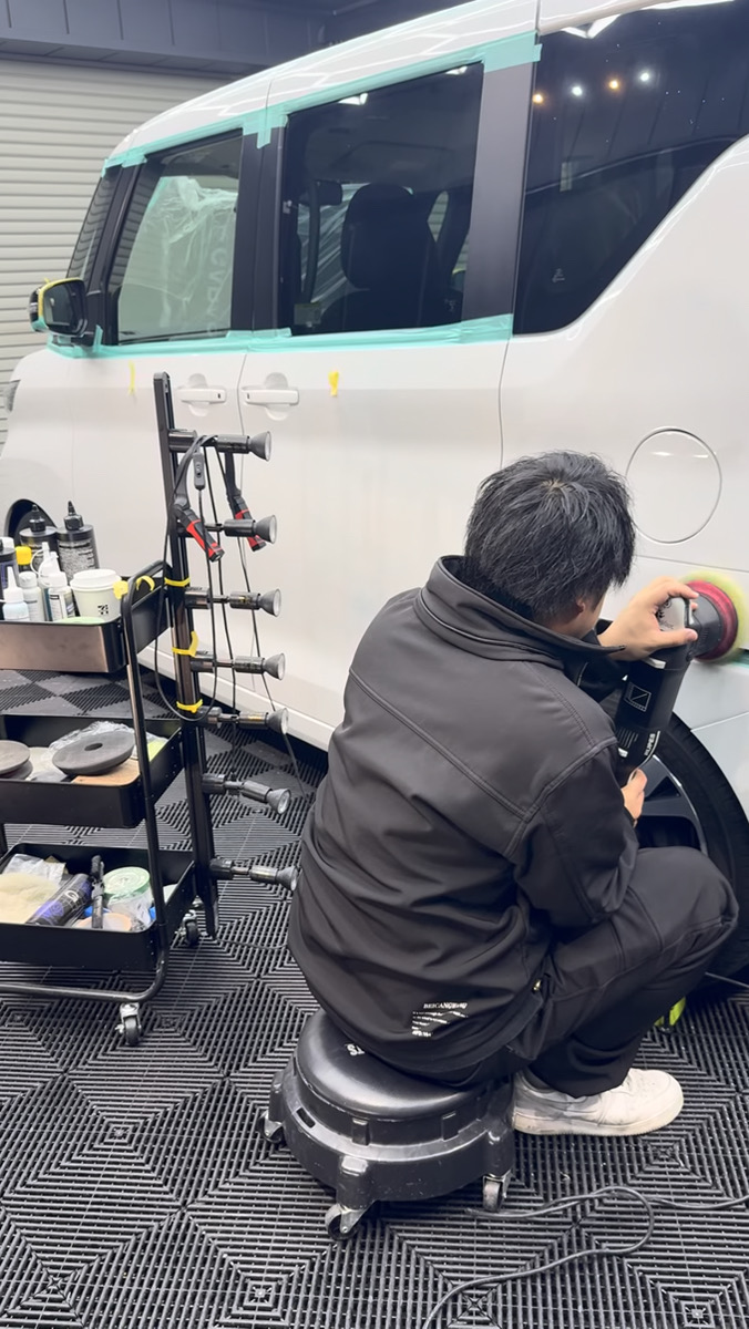 粗目・中目・細目と段階的に研磨剤を変えながら、サンディングの傷を完全に消していきます。日産ルークスの塗装は比較的柔らかめなので、研磨の際は圧力とスピードを慎重にコントロールしながら作業を進めます。